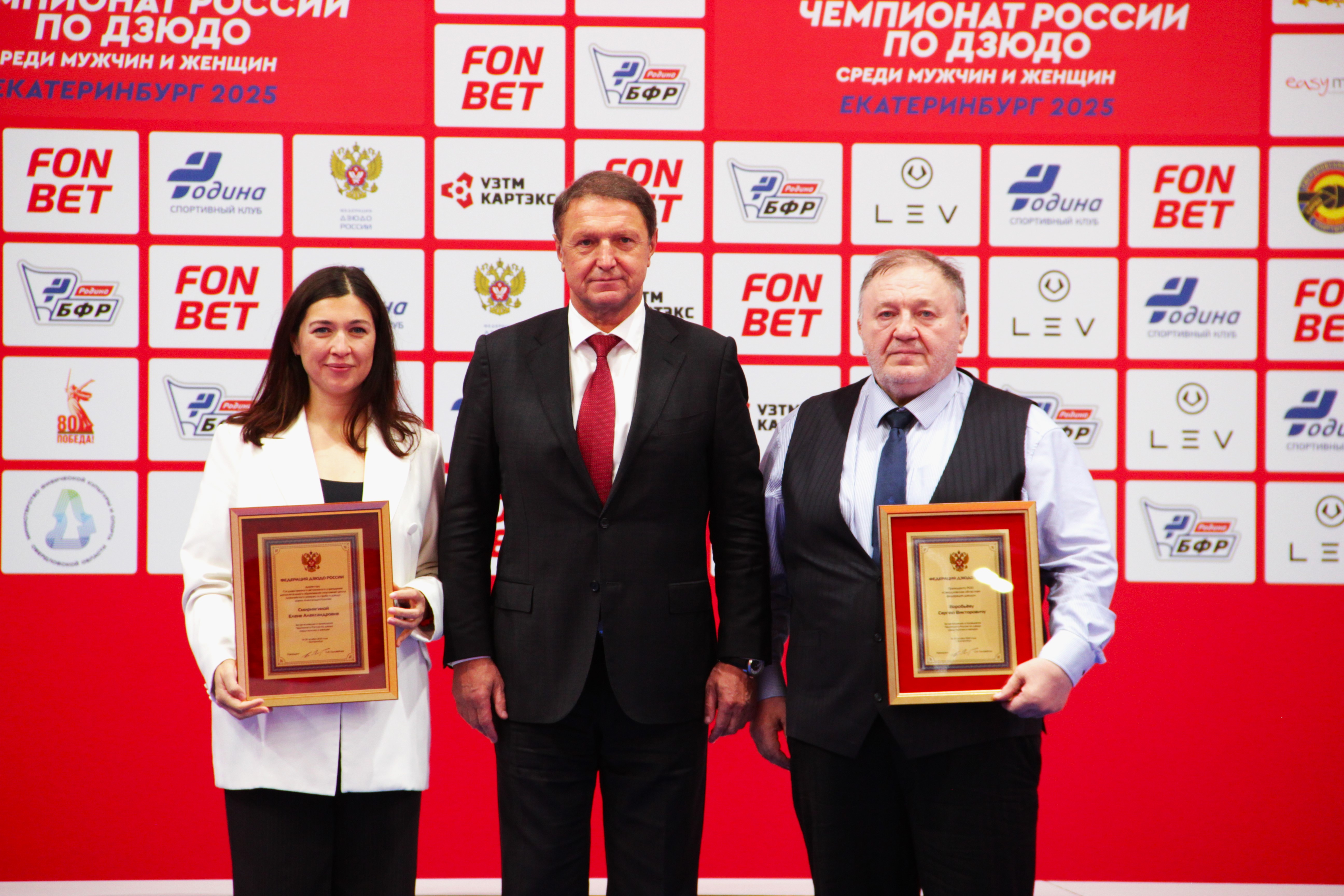 19 октября 2025 года перед началом финального блока российский государственный деятель, заслуженный мастер спорта СССР, Чемпион Европы и Мира по самбо Игорь Михайлович Сидоркевич торжественно наградил благодарственными плакетками за подписью президента Федерации дзюдо России Сергея Игоревича Соловейчика «За организацию и проведение Чемпионата России по дзюдо среди мужчин и женщин» президента РОО «Свердловская областная федерация дзюдо» Воробьева Сергея Викторовича и директора ГАУ ДО СО СШОР по самбо и дзюдо имени Александра Козлова Смирнягину Елену Александровну.