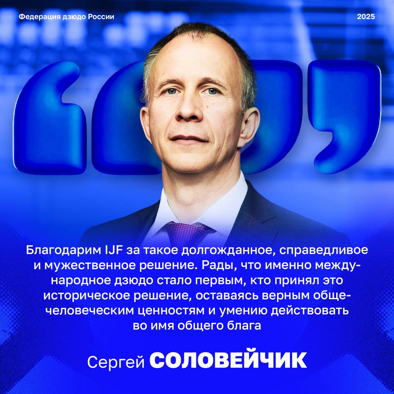 «Благодарим IJF за такое долгожданное, справедливое и мужественное решение, – сказал глава ФДР Сергей Соловейчик. – Рады, что именно международное дзюдо стало первым, кто принял это историческое решение, оставаясь верным общечеловеческим ценностям и умению действовать во имя общего блага. Дзюдо проповедует мужество, решительность и справедливость. Это неизменный постулат IJF: спорт должен содействовать миру и укреплению взаимопонимания между странами. Сейчас все смогли убедиться в этом в очередной раз на деле. Это – реальная политика международной федерации. Политика, благодаря которой российские дзюдоисты выступали на международных стартах не в статусе нейтральных спортсменов, а под флагом IJF. Мы горды быть частью этой международной спортивной семьи, которая поддержала решение. И ждем, что национальные федерации и страны также его поддержат. А те, кто забыл, вспомнят, ради каких целей существует спорт, помимо воспитания силы» — прокомментировал возвращение российского флага дзюдоистам президент ФДР Сергей Соловейчик (https://www.judo.ru/news/22329)